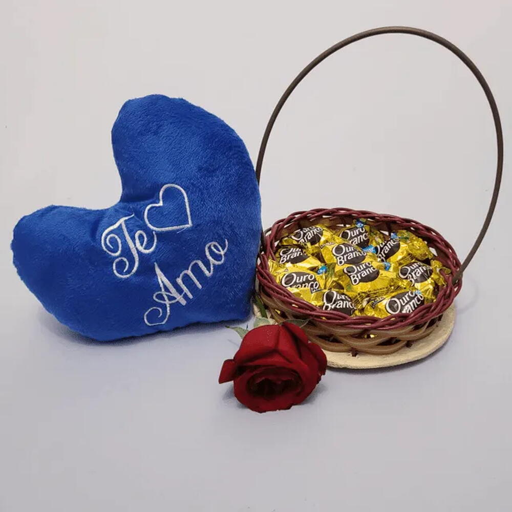 botão de rosa natural - 1 un. pelúcia de coração com escrita sortida - 1 un. bombons lacta ouro branco - 1 un. cestinha artesanal - 1 un.