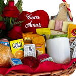 croissant - 1 un. maçã - 1 un. laço - 1 un. pão de mel - 1 un. sachê de chá - 1 un. polenguinho - 1 un. cesta de vime - 1 un. sachê de café solúvel - 1 un. sachê de capuccino - 1 un. arranjo de rosa vermelhas - 1 un. sachê de açúcar - 2 un. sachê de adoçante - 2 un. suco caixinha - 1 un. coração de pelúcia bordado - 1 un. pão fatiado - 2 un. manteiga mini - 1 un. achocolatado caixinha - 1 un. celofane embalagem - 1 un. caneca de porcelana branca - 1 un. torrada bauducco mini - 1 un. frios ( queijo e presunto) - 1 un. geleia de fruta mini - 2 un.