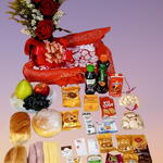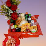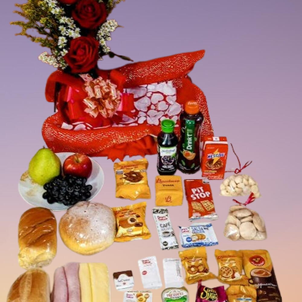 embalagem - 1 un. frutas - 3 un. pão de mel - 1 un. biscoito cream cracker - 2 un. bombons - 2 un. pães - 1 un. blister de geléia - 1 un. bolinho bauduco - 1 un. sonho - 1 un. nescau - 1 un. torrada bauduco - 1 un. bandeja de frios - 1 un. suco de uva natural - 1 un. saché de café - 1 un. blister manteiga - 1 un. chá mate - 1 un. saché de açucar - 1 un. aranjo com 3 rosa - 1 un. biscoitos variados bauduco - 3 un. bolacha de goma - 1 un.