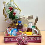 rosa - 2 un. embalagem - 2 un. caneca - 1 un. laço - 1 un. geleia - 1 un. café - 3 un. bandeja - 1 un. bebidas - 2 un. presunto e queijo - 1 un. biscoistos - 5 un.