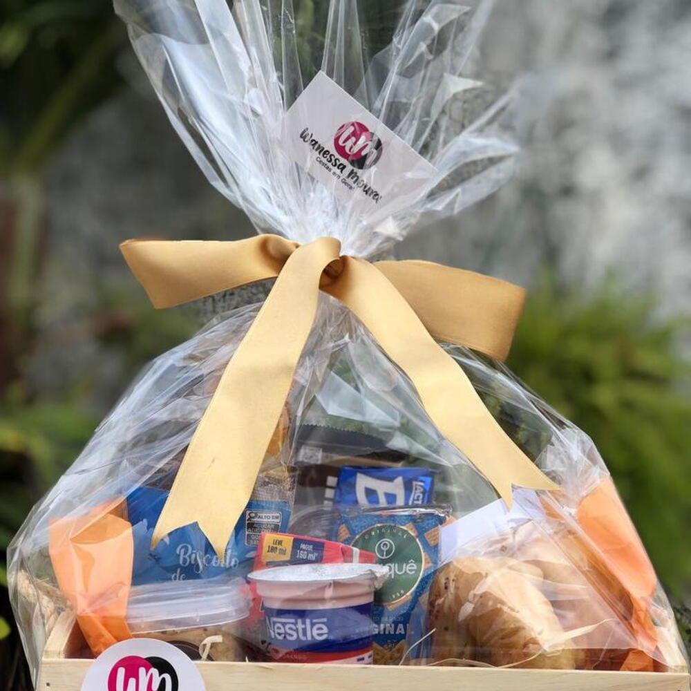 croissant - 4 un. iogurte - 1 un. suco - 1 un. paes - 1 un. cesta - 1 un. laço - 1 un. biscoito salgado - 1 un. biscoito doce - 1 un. achocolatado nescau - 1 un. biscoito de leite - 1 un. embalagem celofane - 1 un. bolo no pote - 1 un. chocolate bis ou barra de chocolate - 1 un.