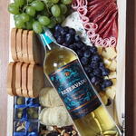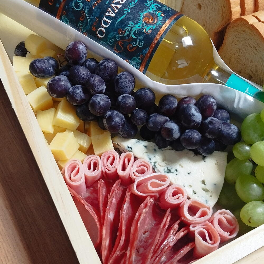 torradas - 8 un. vinho reservado - 1 un. salame fatiado - 100 gr. presunto fatiado - 2 un. queijo gorgonzala - 100 gr. queijo fatiado - 2 un. azeitonas sem caroço - 50 gr. mix castanhas (porção) - 100 gr. salgadinho batata frita pringles - 1 un. queijo cubo - 100 gr. uva verde e roxa (cacho) - 2 un.