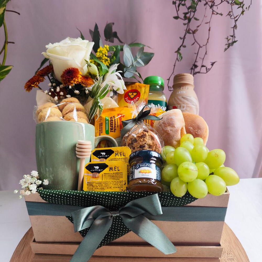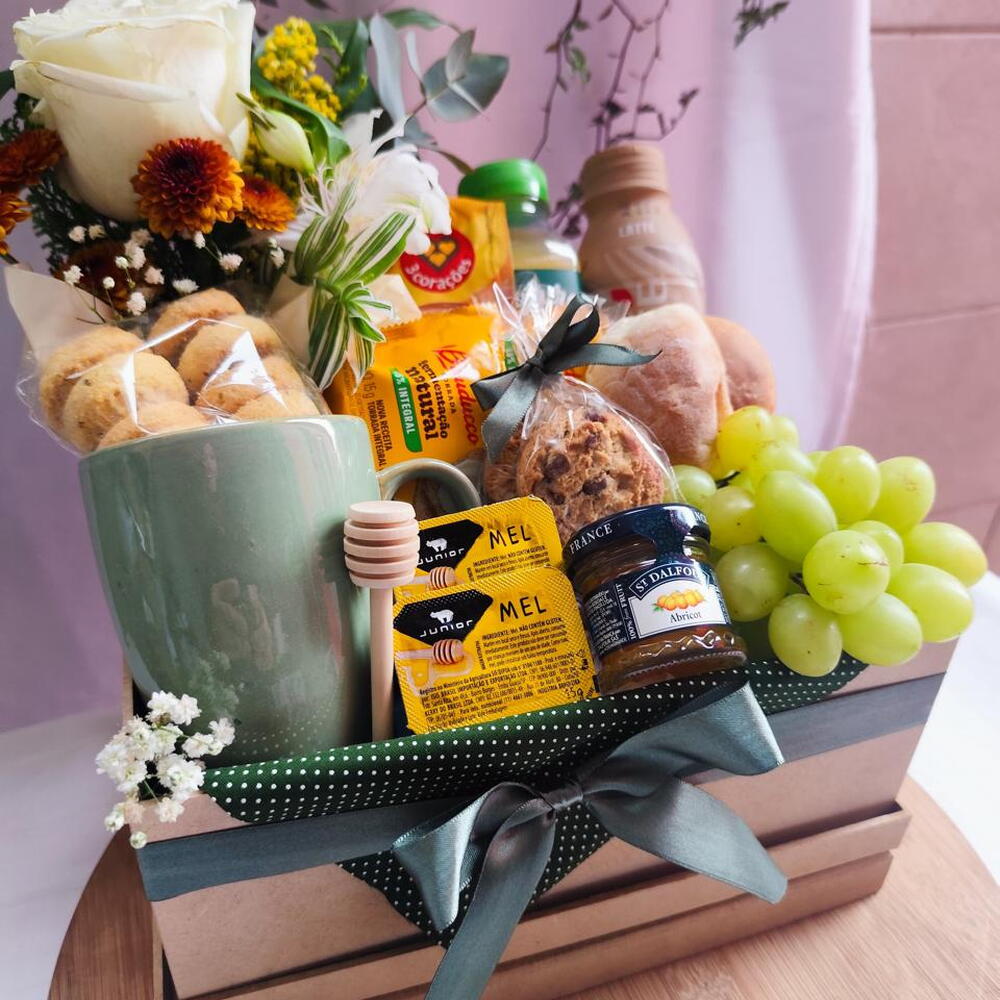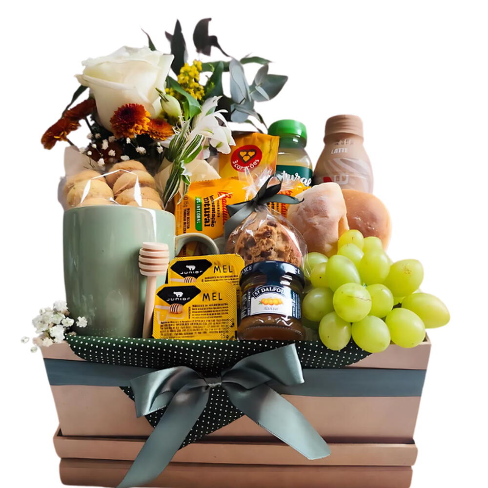 cookies - 1 un. suco de laranja - 1 un. sachê de capuccino - 1 un. porção de uvas - 1 un. pães variados - 1 un. caneca de ceramica - 1 un. mini geléia importada - 1 un. caixa em mdf decorada com tecido e laço de fita - 1 un. sachê de mel individual - 2 un. colher para mel - 1 un. porção de mini broas de milho - 1 un. bebida pornta achocolatada ou a base de café - 1 un. porção individual de torradas - 1 un. arranjo floral natural com mix de flores e folhagens - 1 un.