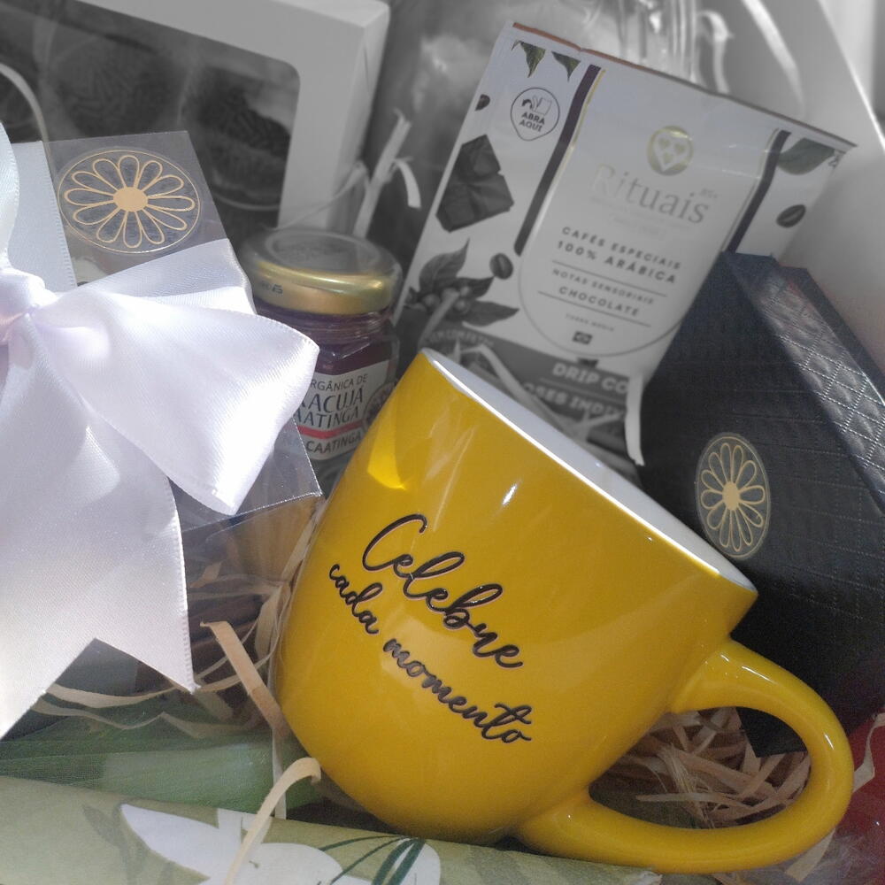 mini pães de queijo - 6 un. cookies de chocolate - 80 gr. kit talheres descartáveis e guardanapos - 1 un. canudos de papel - 1 un. decoração de flores artificiais - 1 un. pães doces variados - 2 un. pães salgados variados - 2 un. drip coffe (café individual) - 1 un. mini pote de geleia sabores diversos - 1 un. caixa de presente com tampa (segue fechada com laço) - 1 un. frios diversos - 150 gr. suco de garrafa integral sabores diversos - 1 un. caneca personalizada com a frase celebre cada momento - cor disponível em estoque - 1 un. sobremesa ou bolo de colher no pote - 1 un. caixa com brigadeiros tradicionais - 6 un. porção de frutas da época - 2 un.