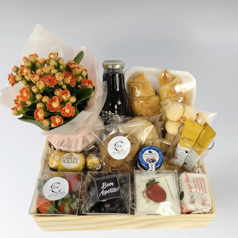 Aprecie um café da manhã requintado com a nossa Cesta de Café da Manhã pronta para servir. A cesta contém: um refrescante suco de uva (300ml). Aproveite o sabor quente e rico do nosso cappuccino importado da marca Dcapri (2 unidades) na elegante caneca de vidro incluída. Seja cativado pelo frescor e sabor único de uma porção de pão de queijo, um pão de batata recheado, duas unidades de croissant crocante e uma porção de torradas. Relaxe e adoçe o paladar com o trio Ferrero Rocher, uma porção de cookies deliciosos e uma geleia Queensberry. A cesta também inclui porções frescas de uvas e morangos e uma porção de iogurte natural. Realçando nossa oferta, esta cesta vem com um belo Kalanchoe em pote e é arrumada em uma bandeja de madeira estilosa, envolta em um saco transparente, graaciosamente amarrada com um sofisticado laço de embrulho de presente. Desfrute da conveniência e do prazer de um café da manhã luxuoso diretamente na sua casa.