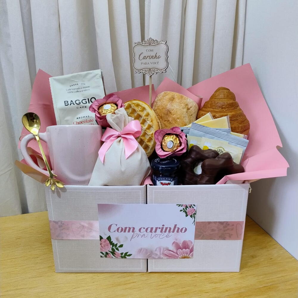 ferrero rocher - 2 un. waffles - 2 un. pão de mel bauducco - 2 un. sachê de chá twinings - 2 un. sachê de cappuccino santa mônica - 2 un. mini geleia dalfour - 1 un. queijo polenghi fatiado - 3 un. croinsant - 1 un. pão tipo ciabatta - 1 un. caneca oxford rosa ou bege - 1 un. colher para café dourada - 1 un. plaquinha em mdf "com carinho" - 1 un. uma linda caixa com laço - 1 un. café baggio ou 3 corações gourmet - 1 un. biscoito amanteigado = porção - 1 un.