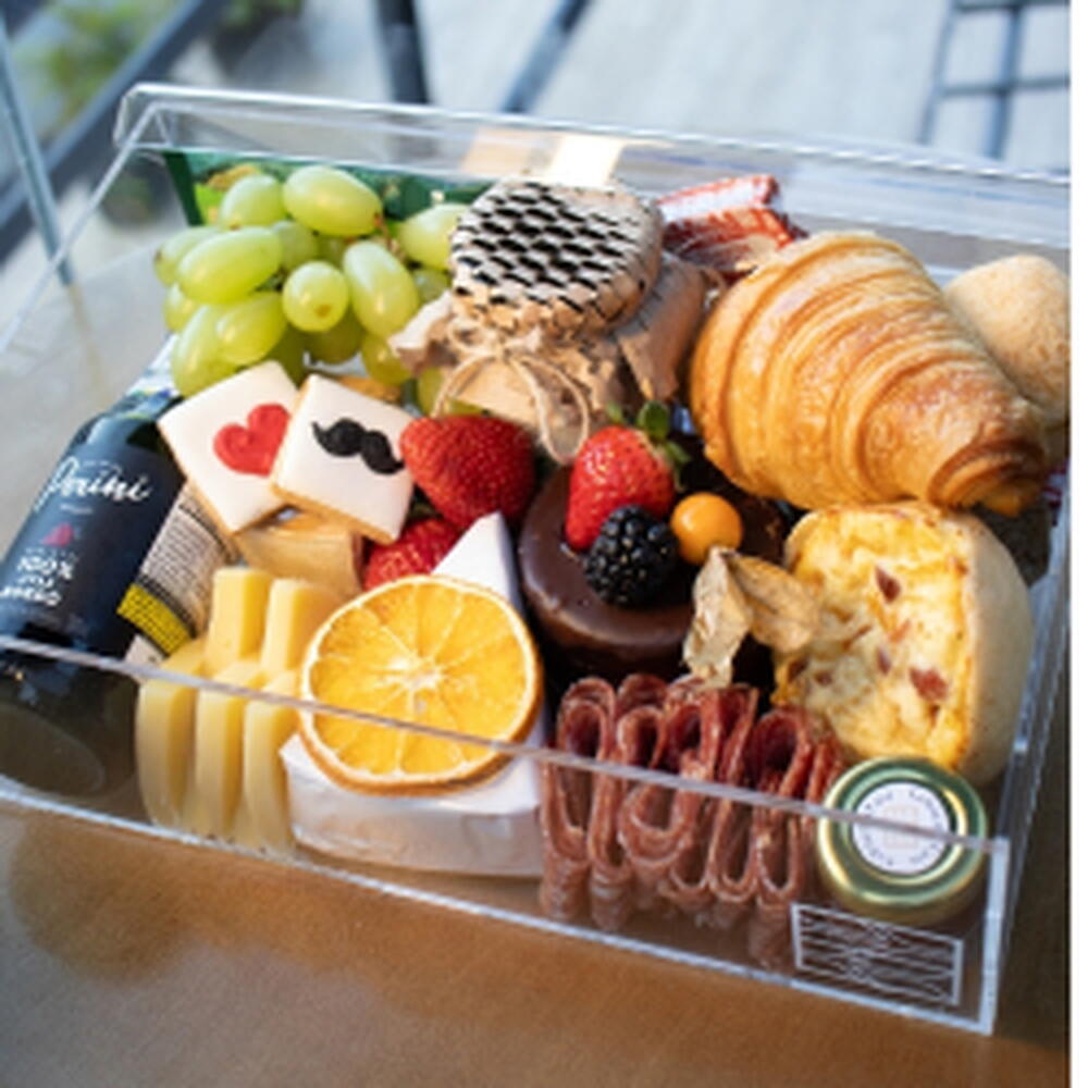 Mime-se com o glamour e a diversidade de sabores da nossa Cesta de Café da Manhã. Esta oferta requintada inclui uma seleção de frutas frescas, um croissant crocante, suco refrescante, torrada, manteiga macia, pães variados, iogurte natural suave, delicioso requeijão e geleia artesanal com um toque caseiro. Além disso, não poderia faltar o nosso café drip, com sabor inigualável. Completa o conjunto, um quiche saboroso, biscoitinhos amanteigados, uma seleção de queijos e frios gourmet e para finalizar, um entremet de chocolate indulgente. Deixe sua manhã mais prazerosa com nossa Cesta de Café da Manhã.