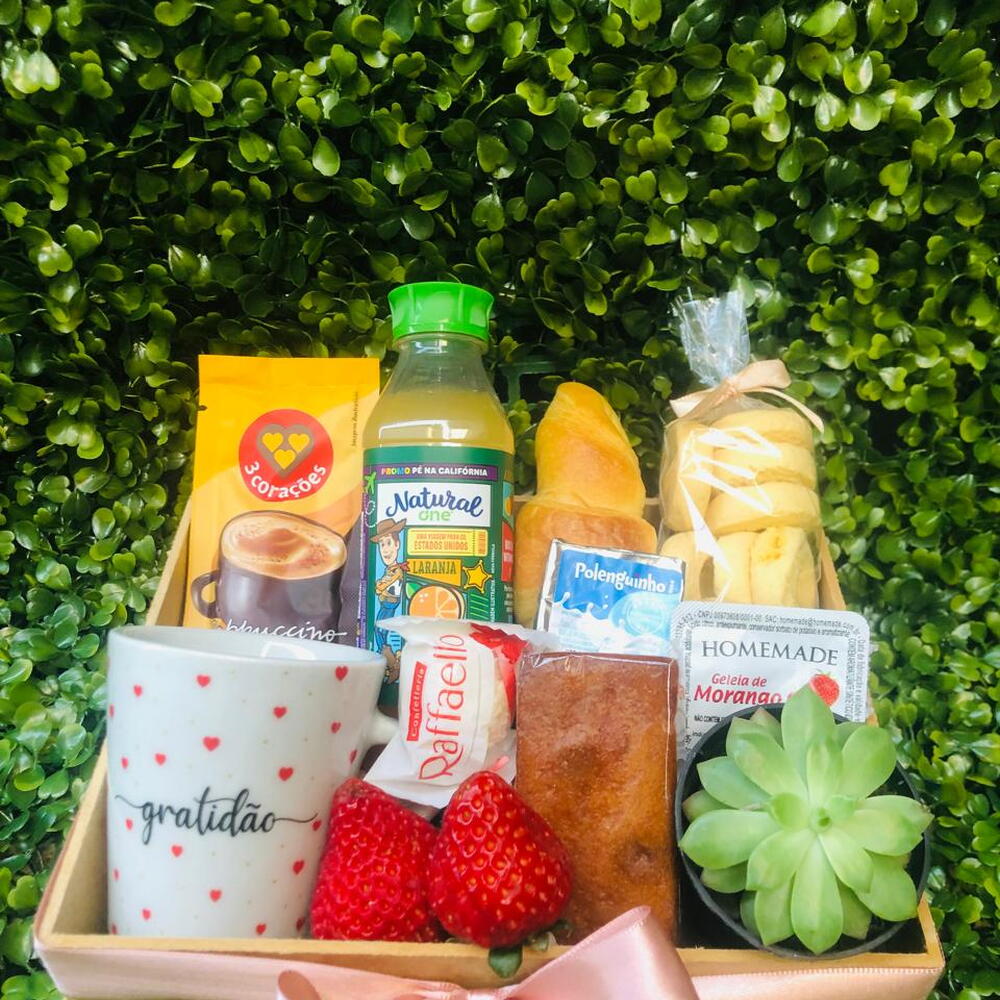 ✨ **Cesta Gratidão** ✨ Um presente cheio de carinho para começar o dia de forma especial! 🌸☕🍓 Essa delicada cesta contém uma seleção afetiva de sabores e detalhes: * Caneca personalizada “Gratidão” 💖 * Suco natural de laranja 🍊 * Café 3 Corações ☕ * Pão de queijo e pãozinho fresco 🥐 * Bolinho caseiro 🍰 * Polenguinho cremoso 🧀 * Biscoitinhos artesanais 🍪 * Morangos selecionados 🍓 * Mini suculenta para eternizar o momento 🌱 Decorada com laço em cetim rosé, é a opção perfeita para surpreender alguém especial com muito amor, afeto e sabor. Ideal para café da manhã, agradecimento ou simplesmente para demonstrar carinho! 💝