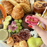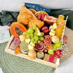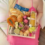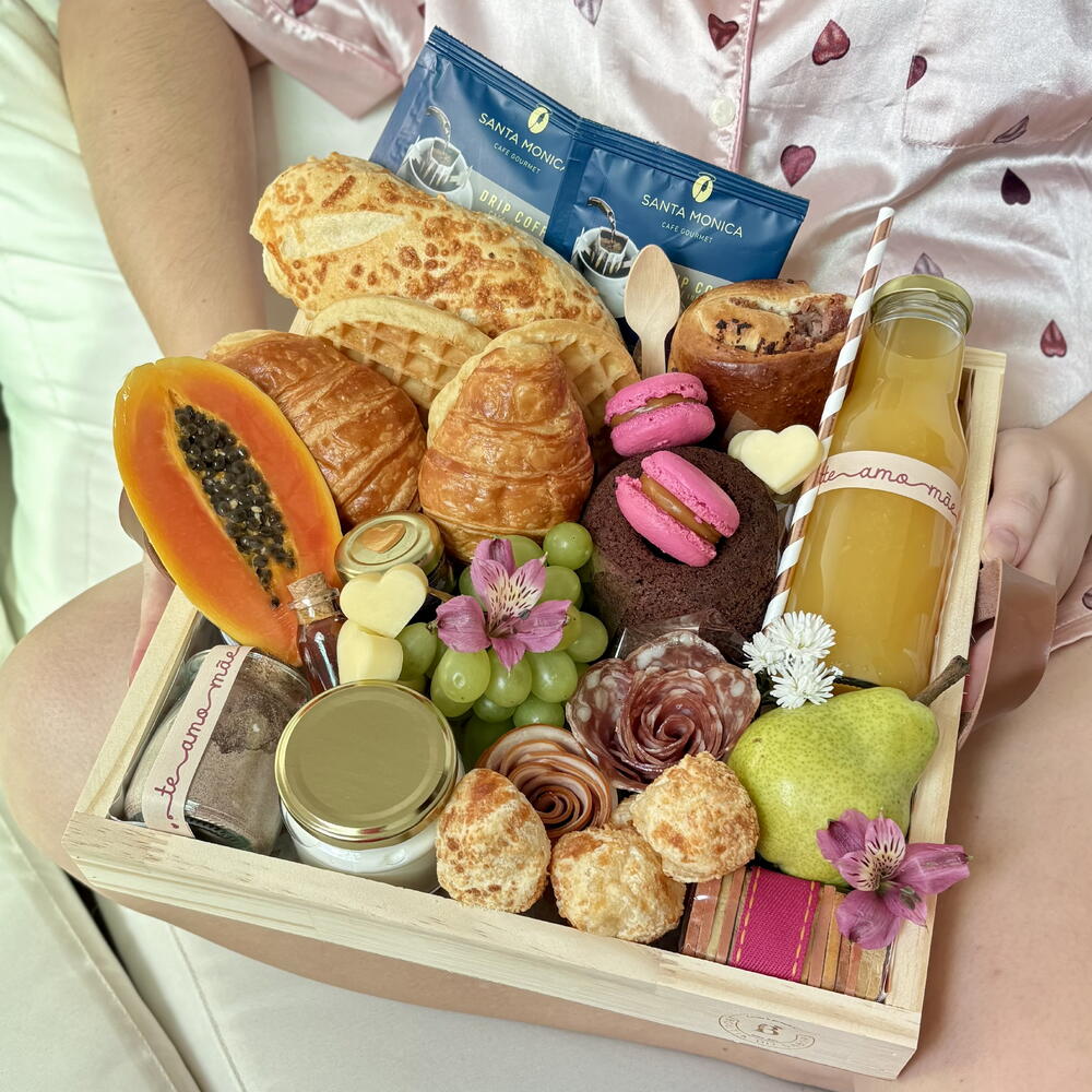 laço - 1 un. manteiga - 1 un. saco celofane - 1 un. croissant amanteigado - 2 un. flor de salame italiano - 1 un. tag - 1 un. waffle americana - 2 un. mel no vidrinho - 1 un. flor de lombo canadense - 1 un. espinafre e cenoura) - 1 un. doce de leite artesanal - 1 un. baguete de queijo parmesão - 1 un. queijo mussarela em formato de coração - 1 un. suco de laranja 300ml na garrafa de vidro - 1 un. bandeja de madeira pinus 30x30cm - 1 un. drip coffee santa monica - 2 un. capuccino artesanal no vidro - 1 un. frutas selecionadas disponíveis do dia - 1 un. geléia de frutas vermlehas no vidrinho - 1 un. pão fofinho de frios - 1 un. bolo de chocolate caseiro - 1 un. mini pães de queijo porção - 1 un. yougurte natural com granola - 1 un. macaron rosa típico francês - 2 un. torradinhas veganas coloridas (beterraba - 1 un.