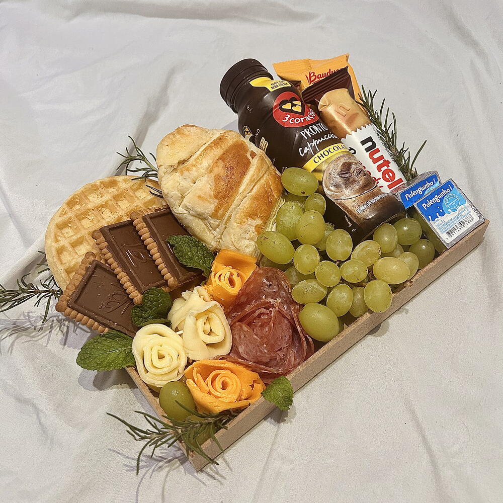 queijo - 40 un. croissant - 1 un. polenguinho - 2 un. nutella B-ready - 1 un. waffle - 1 un. uva verde - 100 gr. salaminho - 30 gr. bauducco choco biscuit - 3 un. cappucino três corações - 260 ml bauducco roll - 1 un.