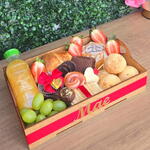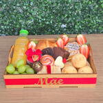 uvas - 1 un. morangos - 1 un. cesta decorada - 1 un. torradas gourmet - 1 un. suco de laranja 180 ml - 1 un. croissant de presunto e queijo - 1 un. tag dia das maes - 1 un. pão de queijo recheados - 1 un. mini bolo com decoração flork frases de mãe (sugestão sabor laranja) - 1 un. pétalas de chocolate meio amargo crocantes - 3 un. bombons de chocolate ao leite de rosa decoração pó de ouro - 2 un. potinho com geléia real com amor (pode trocar por patê ou doce de leite) - 1 un. espeto de rosa de peito de peru com coração de queijo - 1 un. pão de mel recheio tradicional de doce de leite - 1 un.