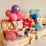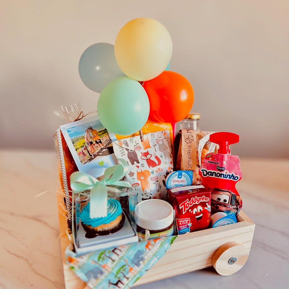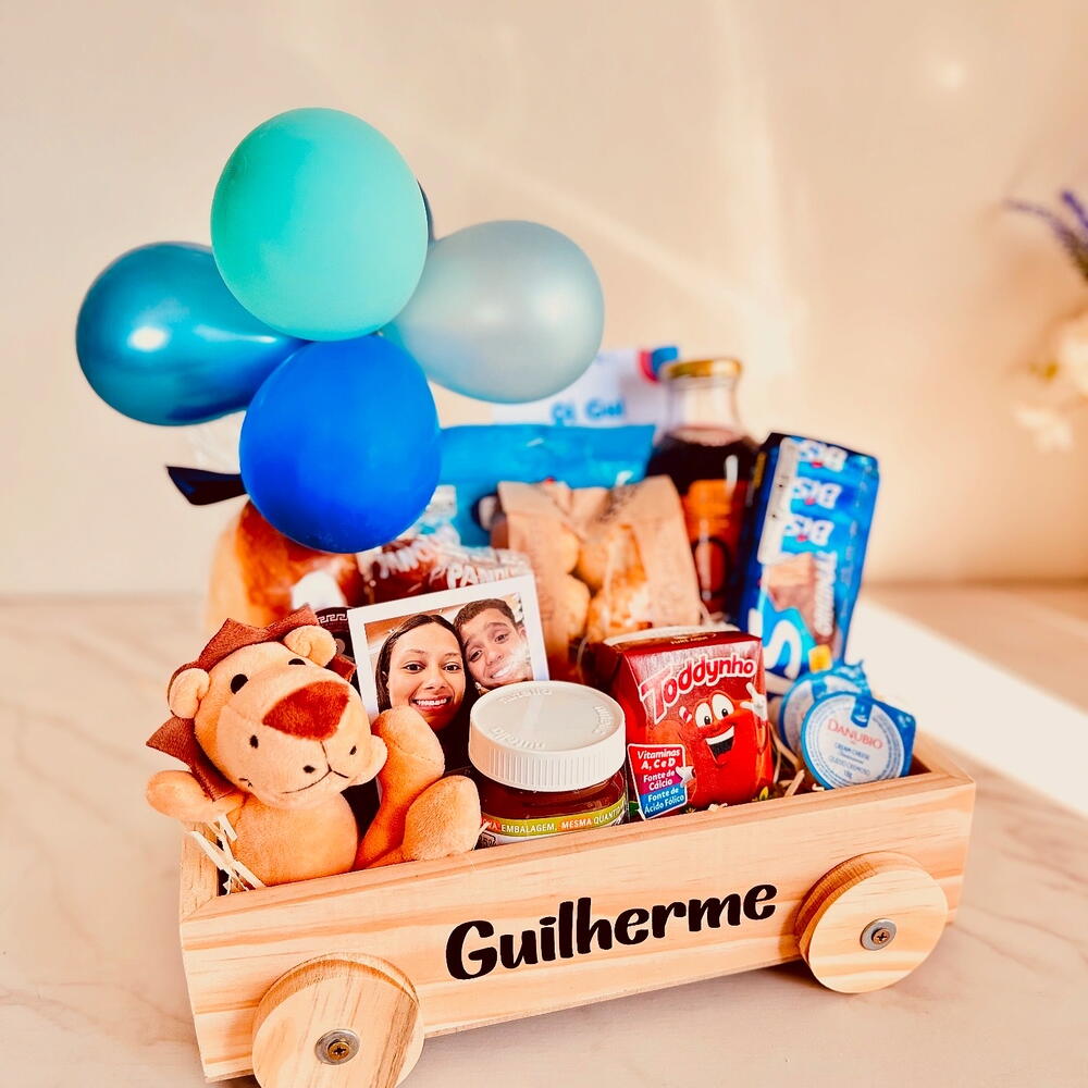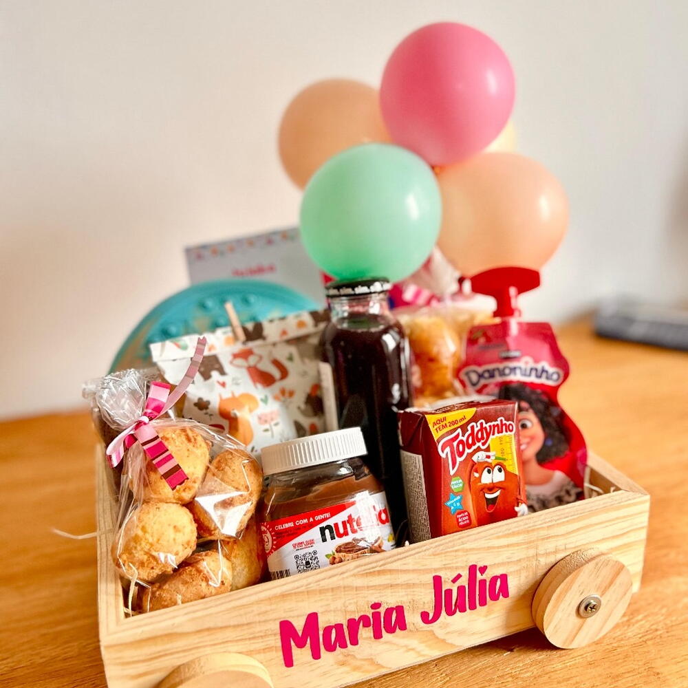 iogurte - 1 un. suco - 500 ml pão de queijo - 150 gr. marshmallow - 1 un. bala fini - 1 un. arranjo de mini balões - 1 un. bolinhos recheados - 2 un. mini pães brioche - 3 un. nutella 140grs - 1 un. achocolatado caixinha (200ml) - 1 un. bandeja com rodinhas personalizada com nome - 1 un. livro de colorir ou pelúcia chaveiro ou 1 cupcake - 1 un. mini crem cheese - 2 un.