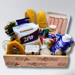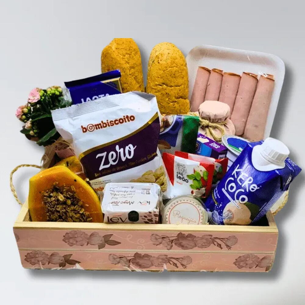arranjo de flores - 1 un. cartão para mensagem - 1 un. queijo polenguinho - 1 un. pão integral (tipo baguete pão francês) - 1 un. bandeja com peito de peru - fatias - 1 un. unidade de iogurte zero - 1 un. cereal - porção de granola (mix de grãos especiais) - 1 un. 1 unidade de suco 100% da fruta sabor laranja - 180 ml magic toast torrada - sachê - 1 un. porção de cookies integral - 1 un. chá nacional - sachê - 1 un. frutas frescas da época (uva - 1 un. mamão eou maçã) - 1 un.