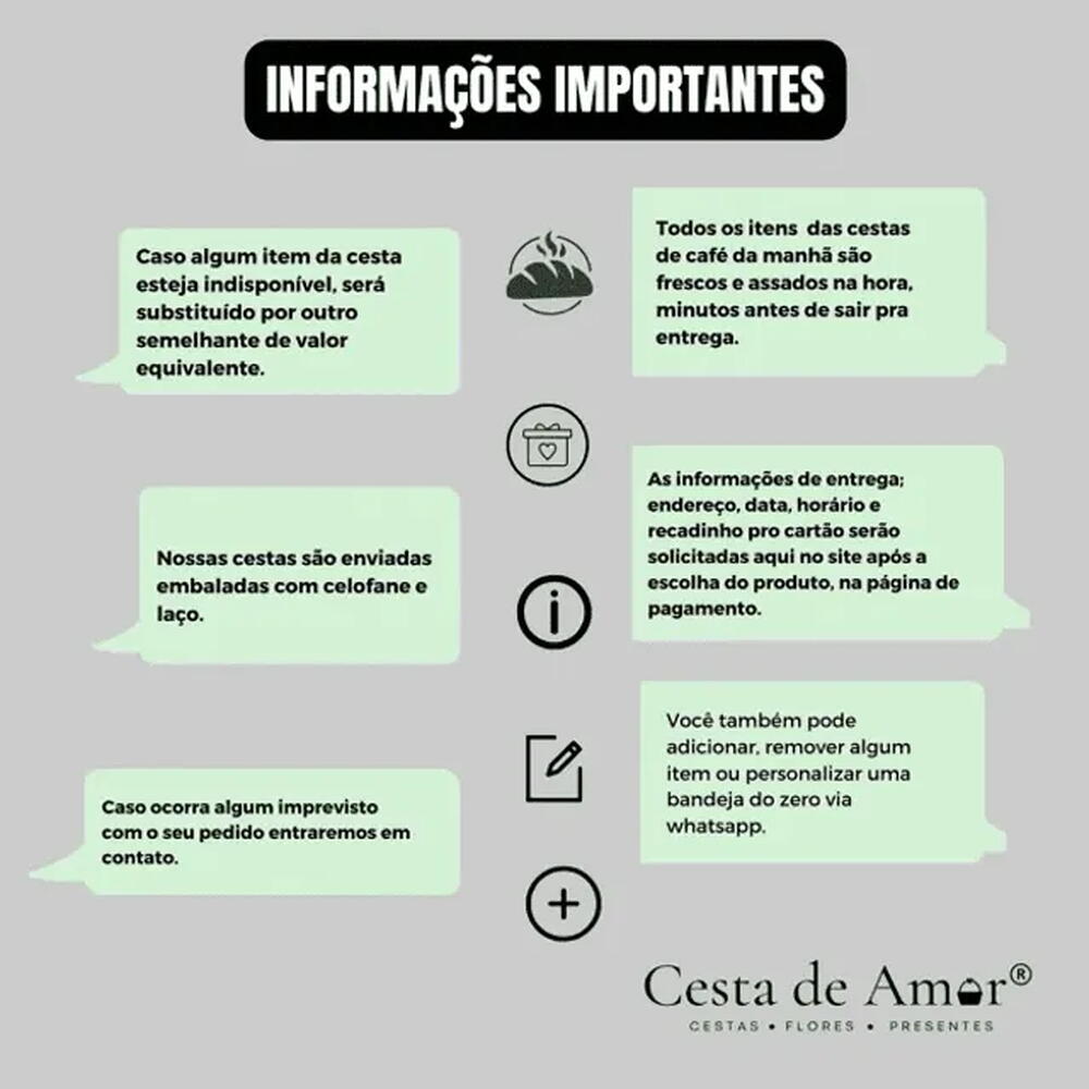 Uma cesta de café da manhã é um presente cuidadosamente preparado, reunindo uma seleção pensada de itens que proporcionam uma experiência reconfortante e especial. Ideal para começar o dia com um toque de carinho e indulgência, cada cesta é uma expressão de cuidado e apreciação.