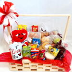 croissant - 1 un. presunto - 1 un. bolinho bauducco - 1 un. biscoitos club social - 2 un. torrada bauducco - 1 un. pera - 1 un. pão doce - 1 un. achocolatado - 1 un. sachê de chá - 1 un. pães de queijo - 1 un. uvas - 1 un. sachês de açúcar - 1 un. pães de leite - 1 un. suco de frutas - 1 un. maça - 1 un. mussarela - 1 un. fatia de bolo - 1 un. cookie bauducco - 1 un. chocolates (sonho de valsa ou serenata de amor ou ouro branco) - 4 un. *brinde* caneca de porcelana y love you - 1 un. *brinde* coraçãozinho de pelúcia - 1 un.