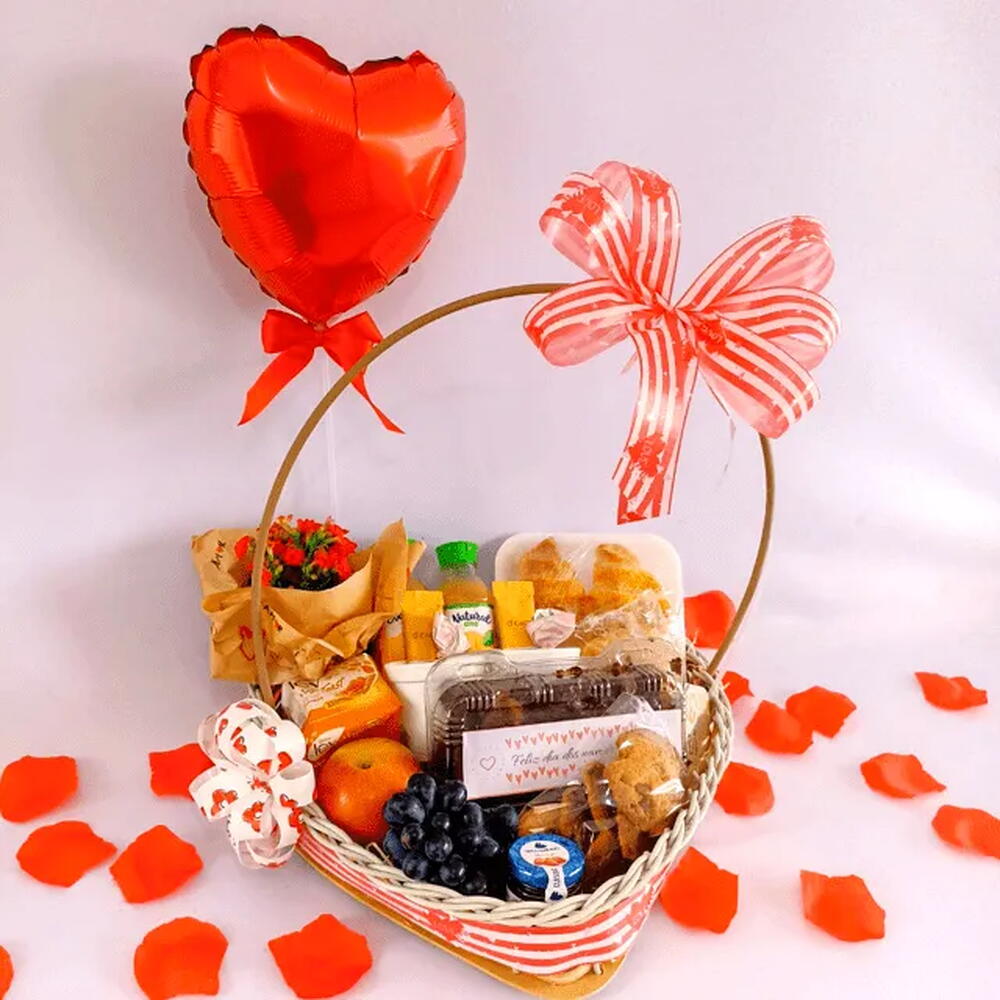 maçã - 1 un. bombons - 2 un. sucos - 2 un. croissants - 2 un. pão de batata recheado - 1 un. mini geleia queensberry - 1 un. sachê de margarina - 1 un. balão de coração metalizado - 1 un. porção de uva - 1 un. porção de cookies - 1 un. magic toast torrada - 1 un. flor kalanchoe no vaso com cachepot decorado - 1 un. fatia de bolo grande - 1 un. cappuccinos di capri - 2 un. cesta em formato de coração decorada - 1 un. saco transparente e laço para embrulho. - 1 un.