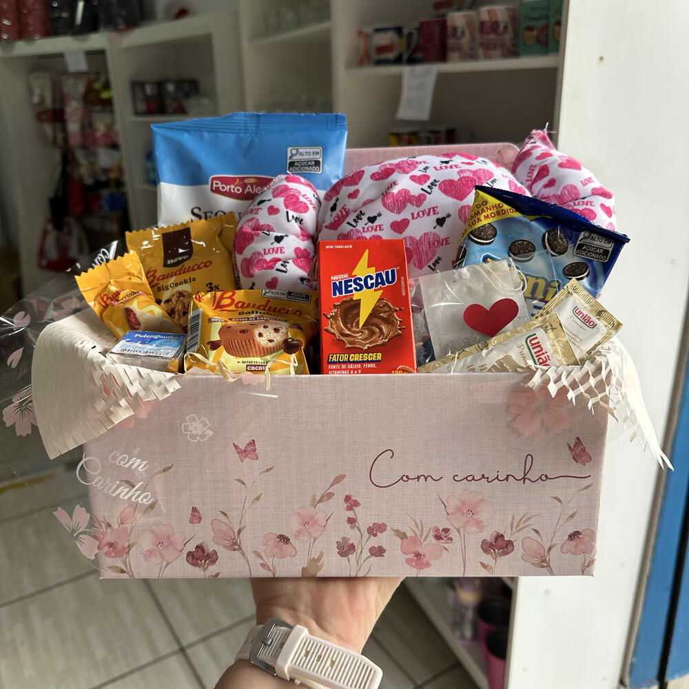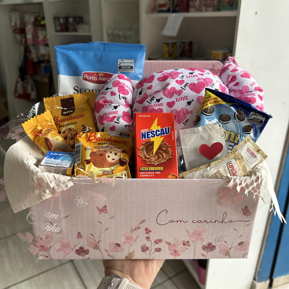 polenguinho 68g - 1 un. bolinho bauducco (40g) - 1 un. almofada - 1 un. sachê de açúcar - 2 un. mini oreo - 1 un. sequilhos - 1 un. barrinha bauducco goiabinha - 1 un. chá (sabores) - 2 un. caixa papelão decorada - 1 un. nescau ou toddynho - 1 un. suco sheffa - 1 un. 1 cookies ou pão de mel bauducco - 1 un.