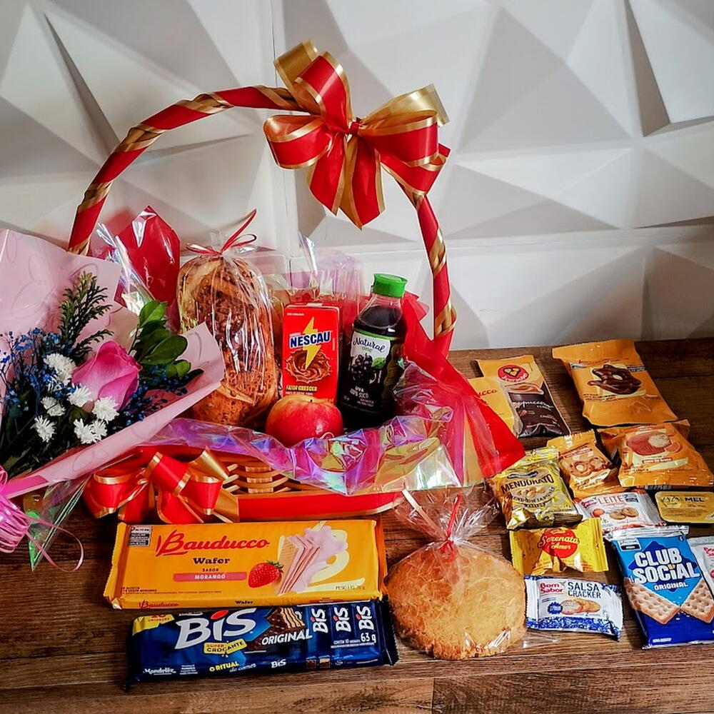 embalagem - 1 un. maçã - 1 un. pão de mel - 1 un. bolinho - 1 un. bombom - 1 un. sachê de café - 1 un. cappuccino - 1 un. cream cracker - 1 un. sachê de açúcar - 2 un. nescau - 1 un. wafer bauduco - 1 un. torrada bauduco - 1 un. cartão de mensagem - 1 un. sachê de geléia - 1 un. suco de uva natural - 1 un. sachê de manteiga - 1 un. rosa presente - 1 un. cesta em fibra sintética decorada - 1 un. pão com queijopresunto - 1 un. biscoitinhos variados - 3 un.