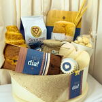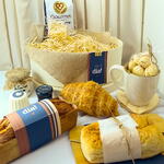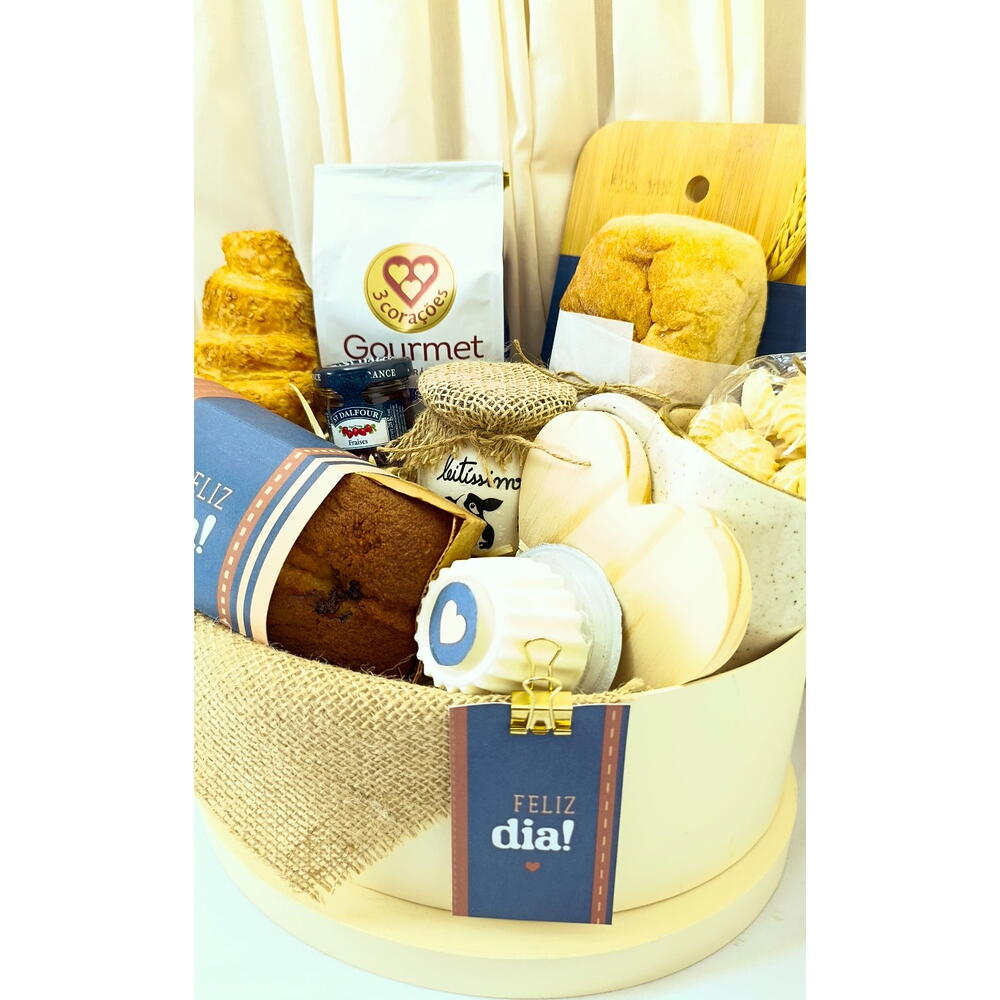 DESCRIÇÃO: Uma cesta charmosa e sofisticada para surpreender aquela pessoa especial com muito carinho. Com itens selecionados e apresentação elegante, é o presente ideal para um café da manhã especial e cheio de amor. COMPOSIÇÃO: Croissant recheado (1un) Pão ciabatta (1un) Bolo tipo Pullman (1un) Biscoitos amanteigados (1un) Queijo frescal (1un) Iogurte natural (1un) Mini geleia St Dalfour (1un) Café 250g (1un) Caneca de porcelana (1un) Tábua de bambu (1un) Suporte de madeira para caneca em formato de coração (1un) Caixa presenteável com acabamento premium e decoração