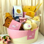 DESCRIÇÃO: Uma cesta charmosa e sofisticada para surpreender aquela pessoa especial com muito carinho. Com itens selecionados e apresentação elegante, é o presente ideal para um café da manhã especial e cheio de amor. COMPOSIÇÃO: Croissant recheado (1un) Pão ciabatta (1un) Bolo tipo Pullman (1un) Biscoitos amanteigados (1un) Queijo frescal (1un) Iogurte natural (1un) Mini geleia St Dalfour (1un) Café 250g (1un) Caneca de porcelana (1un) Tábua de bambu (1un) Suporte de madeira para caneca em formato de coração (1un) Caixa presenteável com acabamento premium e decoração