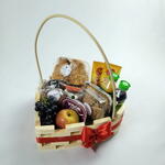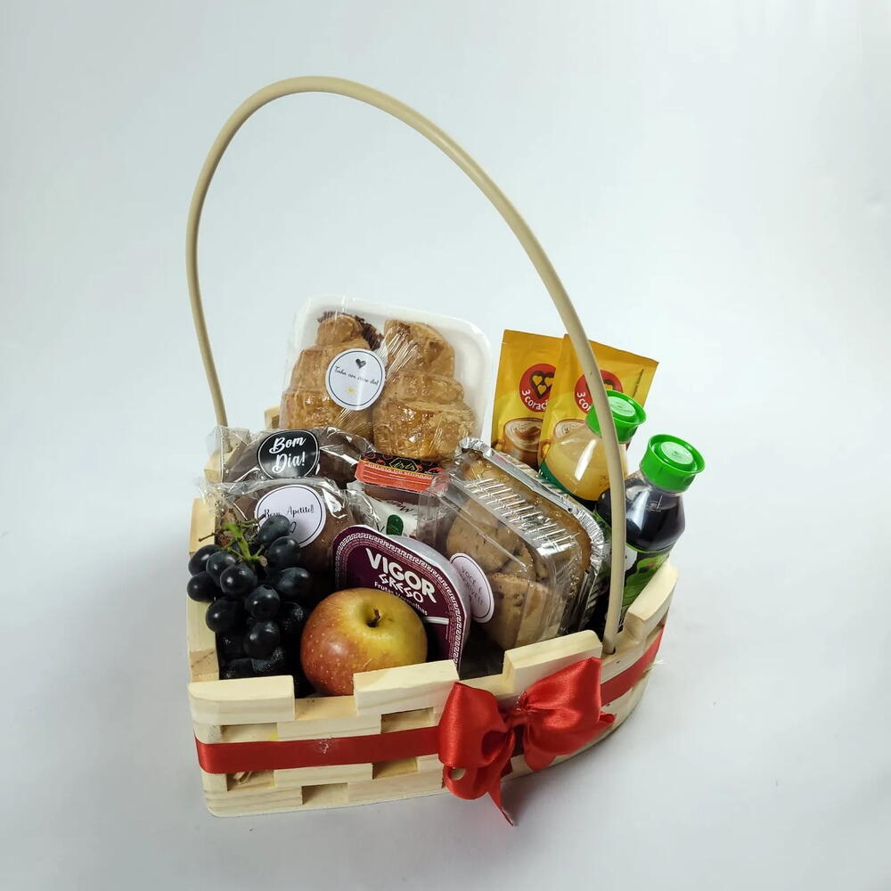 frutas - 2 un. geleia - 1 un. mini bolo - 1 un. porção de torradas - 1 un. pão de batata - 1 un. porção de cookies - 1 un. capuchinno - 2 un. croassaint - 2 un. porção de biscoito - 1 un. 2 sucos - 180 ml iogute - 1 un. cesta em formato de coração em madeira de pinos - 1 un. saco transparente celofane e laço para embalagem - 1 un.