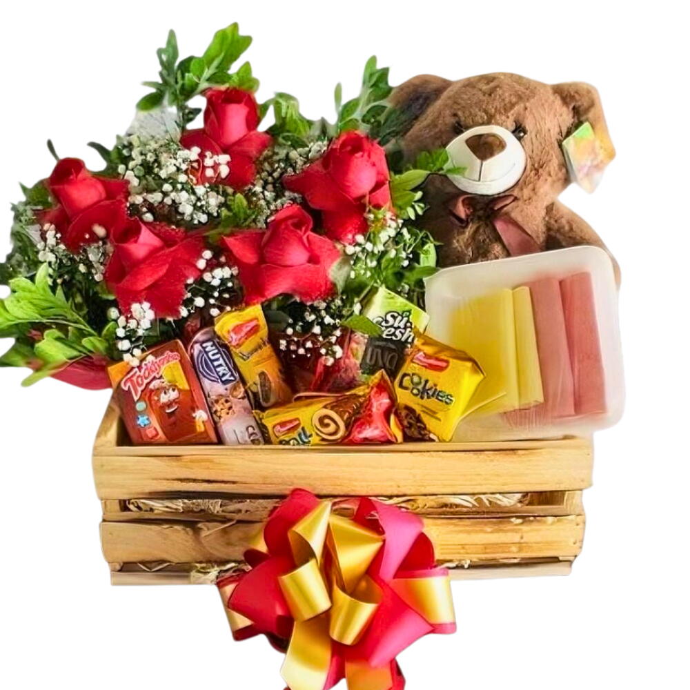 Para um começo de dia perfeito: rosas deslumbrantes, uma pelúcia fofa e um café da manhã delicioso. Composição: 01 Arranjo de 5 Rosas 01 Pelúcia 35cm 01 Bandeja de Frios 01 Bandeja de Pães 01 Cereal Nutry 22g 01 Achocolatado Toddynho 200ml 01 Cookies tradicional Bauducco 60g 01 Barrinha sabor chocolate Bauducco 25g 01 Bolinho sabor chocolate Bauducco 34g 01- Suco Sabores 200ml 01 Caixote de madeira decorado 23x37cm 01 Celofane para acabamento 01 Saco plástico transparente 01 Laço decorativo para presente