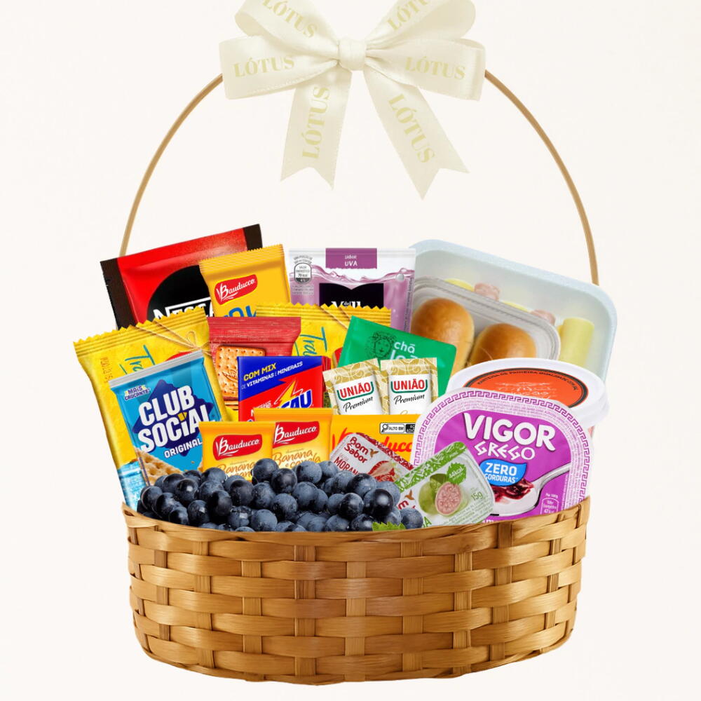 Café da Manhã Itens: 1 Suco Kapo (sabor pode variar) 1 Bandeja Frios (preseunto e queijo) 4 Pãozinho de Batata 1 Iorgute Grego 1 Manteiga Aviação 2 Sachê de Geléia 1 Club Social 1 Torrada 1 Achocolatado Nescau 1 Sachê de Chá 2 Sachê de Açúcar 1 Café Solpuvel UVA Informações Adicionais: Todos os presentes são finalizados com celofane e fita de cetim. Todos os nossos produtos são finalizados com papel celofane e fita de cetim.