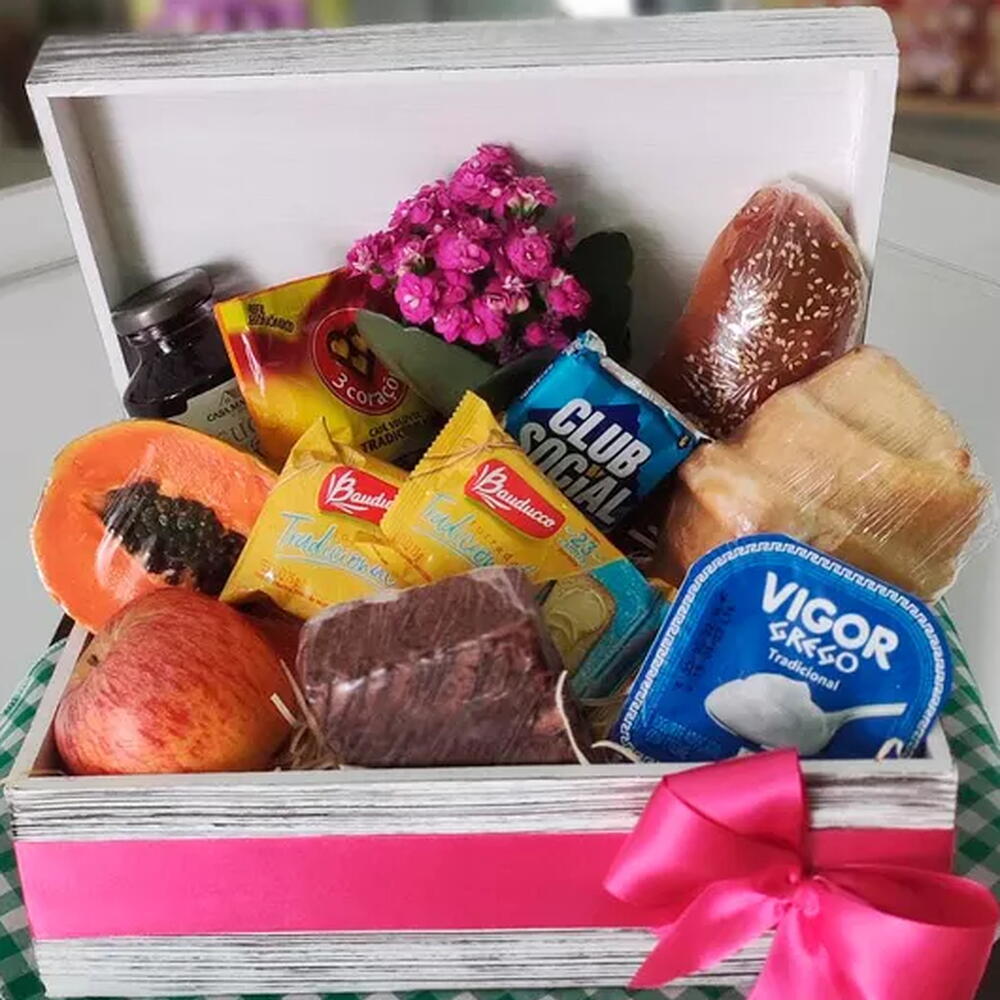 torradas - 1 un. club social - 1 un. iogurte grego - 1 un. croissant doce - 1 un. baguete recheada - 1 un. suco uva integral - 1 un. laço em cetim - 1 un. caixa (box) - 1 un. brownie chocolate - 1 un. tipos de frutas da época - 2 un. pct café soluvel 50 grs - 1 un. vaso mini kalandiva - 1 un.