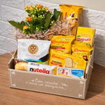 A Cesta Café Afetivo com Flor Viva reúne uma flor viva delicada e uma seleção especial de café gourmet, suco integral, Nutella, geleia, bolinhos e biscoitos. Um presente completo, aconchegante e cheio de cuidado, perfeito para demonstrar carinho, gratidão ou tornar o dia de alguém mais especial