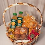 chocolates variados - 2 un. laço - 1 un. pães - 4 un. cesta decorada - 1 un. suco natural 200ml - 2 un. mini sonhos - 4 un. salgados sortidos - 4 un.