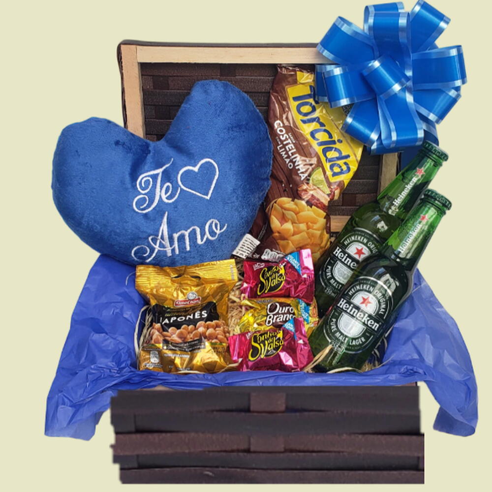 bombons - 3 un. coração pelúcia - 1 un. cervejas heineken 250ml - 2 un. salgadinho torcida 80g - 1 un. amendoim 90g - 1 un.