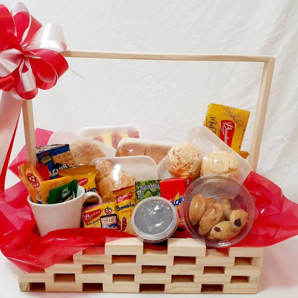 croissant - 1 un. presunto - 1 un. bolinho bauducco - 1 un. biscoitos club social - 2 un. torrada bauducco - 1 un. pão doce - 1 un. pães de queijo - 1 un. pães de leite - 1 un. achocolatado nescau - 200 ml sachês de chá - 2 un. mussarela - 1 un. fatia de bolo - 1 un. suco de fruta - 200 ml sachês de açucar - 1 un. cookie bauducco - 1 un. biscoitinho de goiaba - 1 un. *brinde: uma caneca.* - 1 un. chocolates (sonho de valsa ou ouro branco) - 1 un.