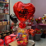 barra de chocolate - 1 un. bombom - 1 un. achocolatado - 1 un. salgadinho - 1 un. kitkat - 1 un. caixa de bombom - 1 un. suflair - 1 un. balão metalizado - 1 un.