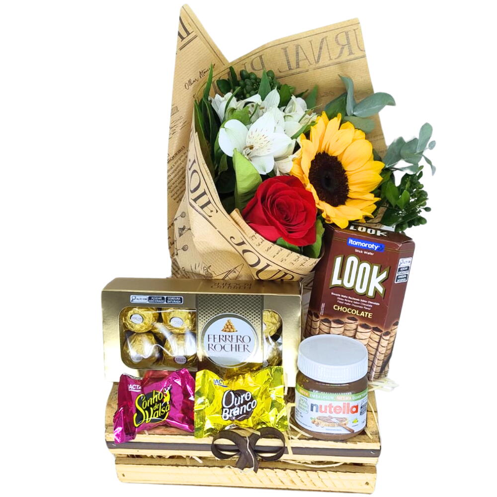 A Cesta de Chocolate - Brilho de Amor é uma combinação doce e especial, ideal para expressar carinho e afeto. Composta por chocolates variados, um girassol vibrante, rosas vermelhas e o inconfundível pote de Nutella, esta cesta é perfeita para transformar o dia de alguém em um momento inesquecível. Surpreenda com essa seleção de chocolates e flores que simbolizam alegria e amor.