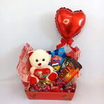 urso de pelúcia - 1 un. ruffles - 1 un. balão de coração metalizado - 1 un. barras de chocolates - 1 un. porção de bombons variados - 1 un. cesta com estampa romântica - 1 un. saco transparente e laço para para embrulho. - 1 un.