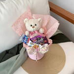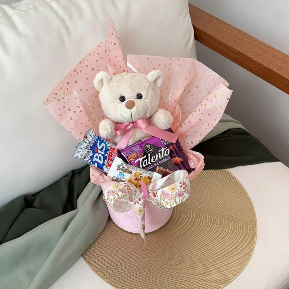 laço - 1 un. chocolate bis extra - 1 un. chocolate talento - 1 un. saco celofane transparente - 1 un. chocolate tortuguita - 1 un. cesta com linha rosa - 1 un. ursinho de pelúcia 28cm - 1 un.
