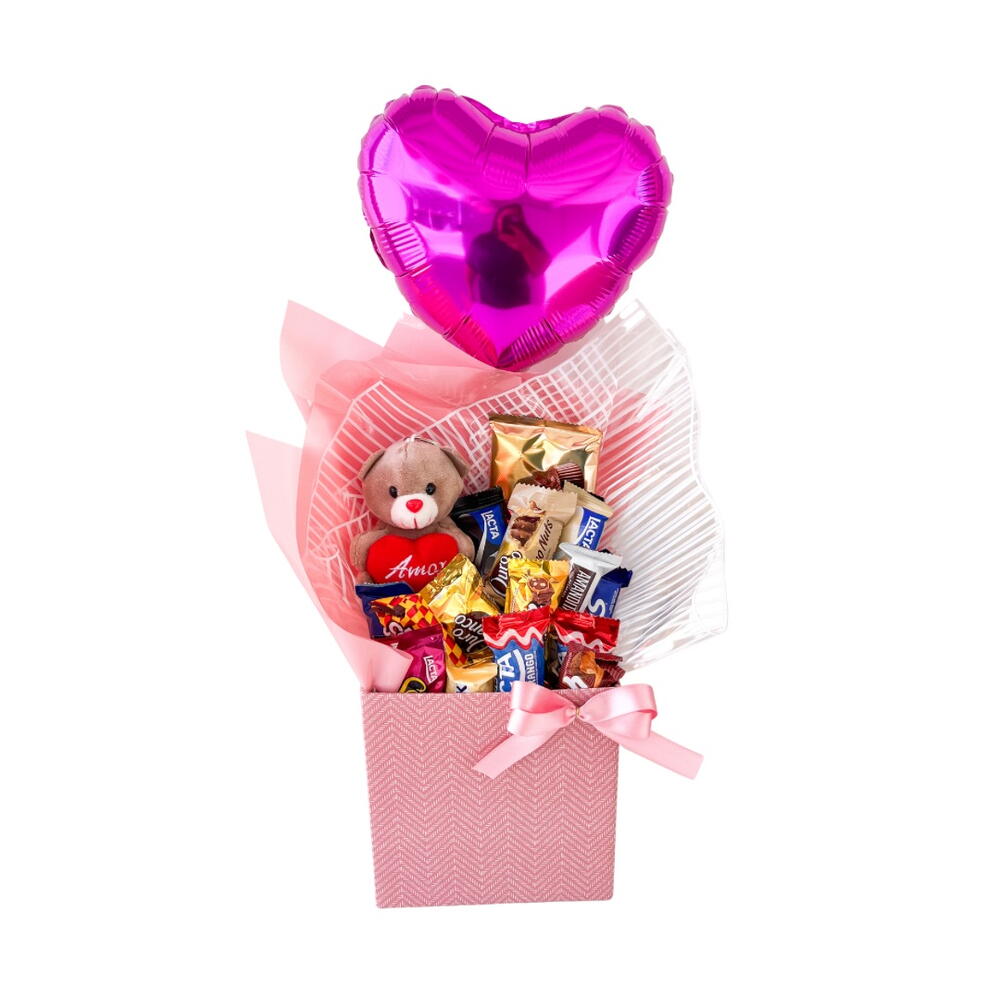 Esta deliciosa Cesta de Chocolate foi cuidadosamente composta com os melhores e mais saborosos doces. Inclui uma barra de chocolate premium, um atrativo urso de chocolate, 15 bombons sortidos com sabores variados para despertar seu paladar, um balão personalizado de 20cm para tornar seu presente ainda mais especial, embalados em uma caixa elegante. Tudo isso é delicadamente embrulhado e amarrado com um fino laço de cetim, aumentando a sensação exclusiva. É um presente perfeito para expressar seu amor, gratidão ou simplesmente para mimar alguém querido.