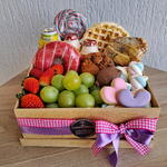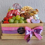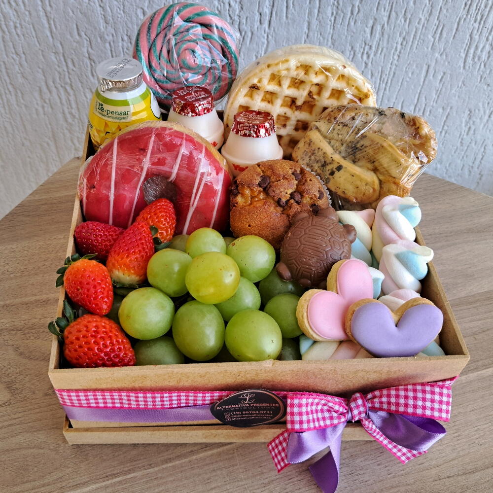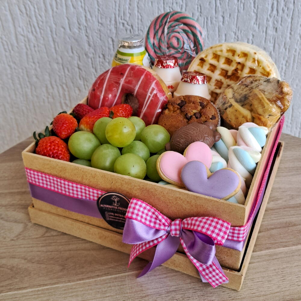 iogurte - 1 un. pirulito colorido - 1 un. waffles - 2 un. caixa mdf decorada - 1 un. marshmallows - 6 un. uvas verdes sem caroço - 1 un. dunuts - 1 un. leite fermentado - 1 un. panificação salgada - 1 un. biscoito artesanal decorado - 1 un. uvas roxas ou morangos - 1 un. muffin gotas chocolate - 1 un. mini barra talento - 1 un. laço e saco e saco celofane para embrulho - 1 un.