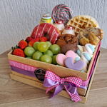 Apresentamos uma encantadora Cesta Infantil recheada com diversas guloseimas perfeitas para a alegria e diversão das crianças. A cesta contém uma unidade de cremoso iogurte, um delicioso bolinho, um vistoso pirulito colorido, duas unidades de crocantes waffles, além de uma atrativa caixa de MDF decorada. Também inclui uma porção de suaves marshmallows, uvas verdes sem caroço, um saboroso donut, duas unidades de leite fermentado, irresistível chocolate Tortuguita, requintada panificação salgada e um biscoito artesanal decorado que é uma verdadeira obra de arte comestível! Para completar, temos ainda as uvas roxas ou morangos conforme a escolha. Tudo isso acompanha um laço e saco de celofane para embrulho, aumentando ainda mais o encanto desta cesta que é um verdadeiro tesouro lúdico-gastronômico.