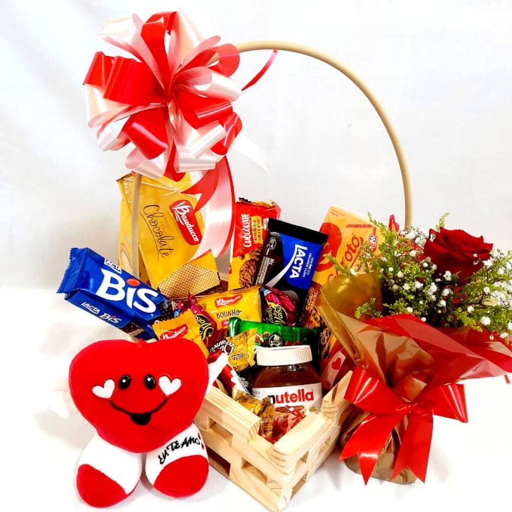 barra de chocolate - 1 un. nutella - 1 un. caixa de bis - 1 un. sonhos de valsa - 3 un. bolinho bauducco - 1 un. ouro branco - 3 un. talento - 1 un. cookie bauducco - 1 un. waffer bauducco - 1 un. arranjo com uma rosa - 1 un. batons garoto - 2 un. caixa de chocolate garoto ou nestle - 1 un. pelúcia (coração eu te amo!) - 1 un.
