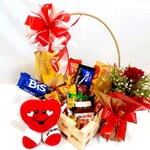 Desperte os seus sentidos com esta linda Cesta de Chocolate, recheada com as melhores delícias do mundo do cacau. A cesta inclui uma suculenta barra de chocolate, dois incríveis batons Garoto, três tentadores bombons Ouro Branco e Sonhos de Valsa, uma viciante caixa de Bis e uma deliciosa barra de Talento. Para adicionar um toque especial, também incluímos um wafer Bauducco, um cookie Bauducco, um bolinho Bauducco e um pote de irresistível Nutella, além de uma caixa de chocolate Garoto ou Nestlé à sua escolha. A cereja no topo desta generosa oferta é uma adorável pelúcia em forma de coração com a inscrição Eu te amo!, e um elegante arranjo com uma rosa. Esta cesta de chocolate é o presente perfeito para surpreender e derreter o coração de quem você ama.
