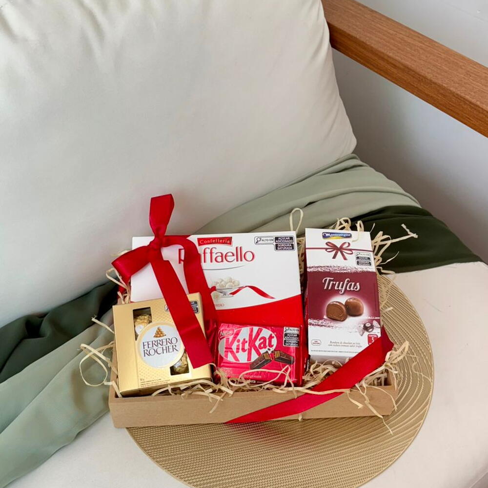 laço - 1 un. saco celofane - 1 un. caixa de trufas - 1 un. caixa de chocolates rafaello 90g - 1 un. chocolate kit kat ao leite - 1 un. caixa de bombons ferrero rocher 4 unidades - 1 un. caixa de madeira mdf 30x20cm - 1 un.