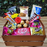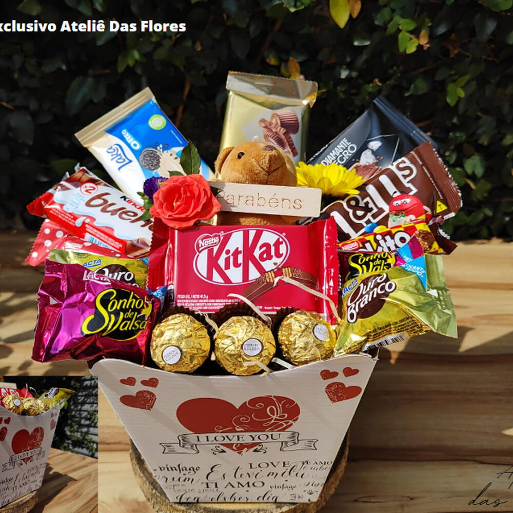 - 1 Barra de chocolate Laka 90gr - 1 Barra de chocolate Alpino 90gr - 1 Barra de chocolate Diamante Negro 90gr - 1 Kit Kat - 1 M&M - 1 Kinder Bueno - 3 Bombons Ferrero Rocher - 2 Bombons Sonho de Valsa - 2 Bombons Ouro Branco - 1 Chokito - 1 Sensação - 1 Ursinho de pelucia enviaremos as opções pelo chat com o cliente