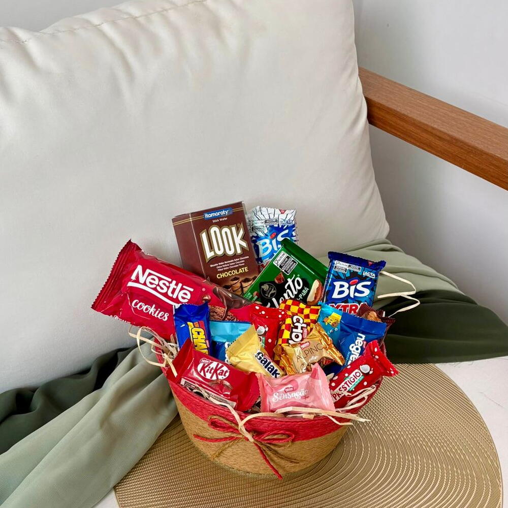 cesta redonda kraft com vermelho - 1 un. seleção de chocolates sortidos - 1 un.