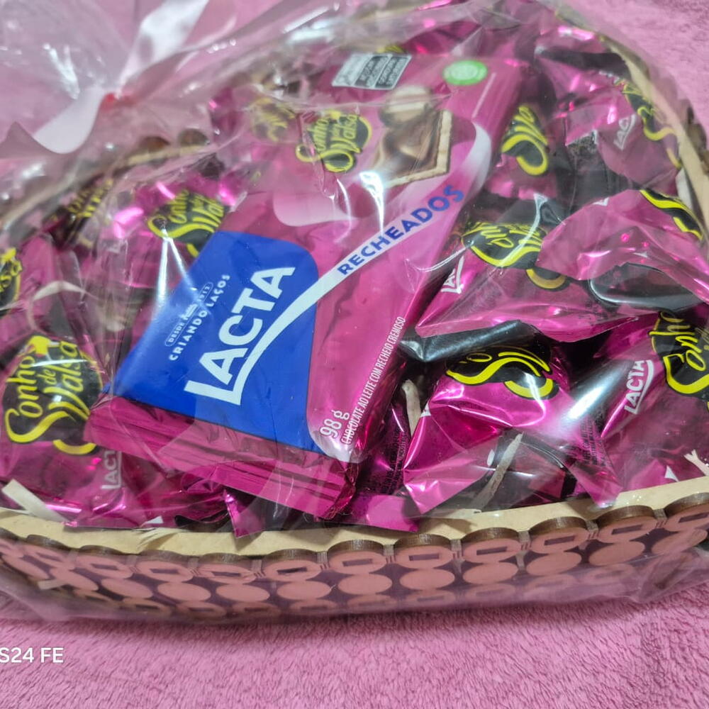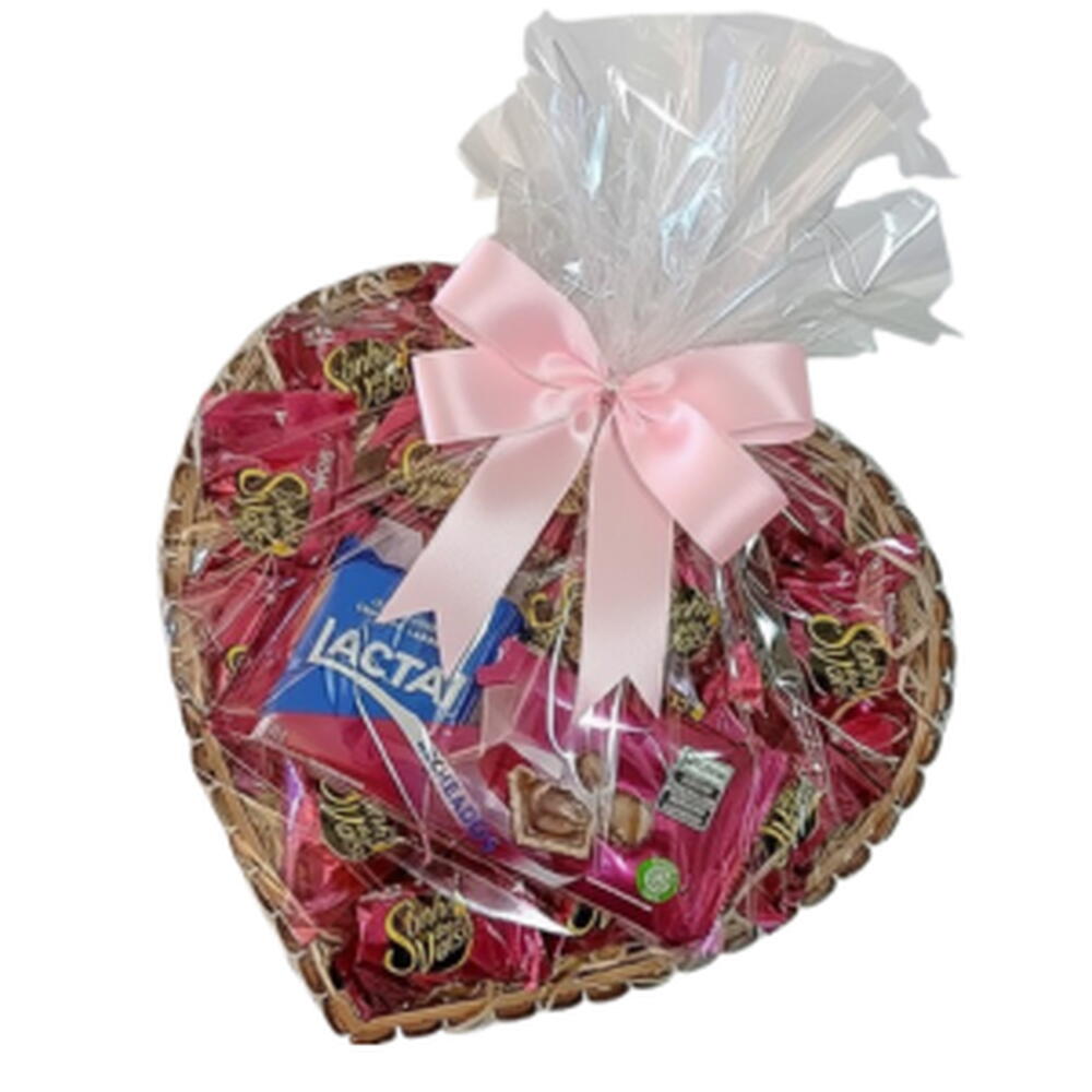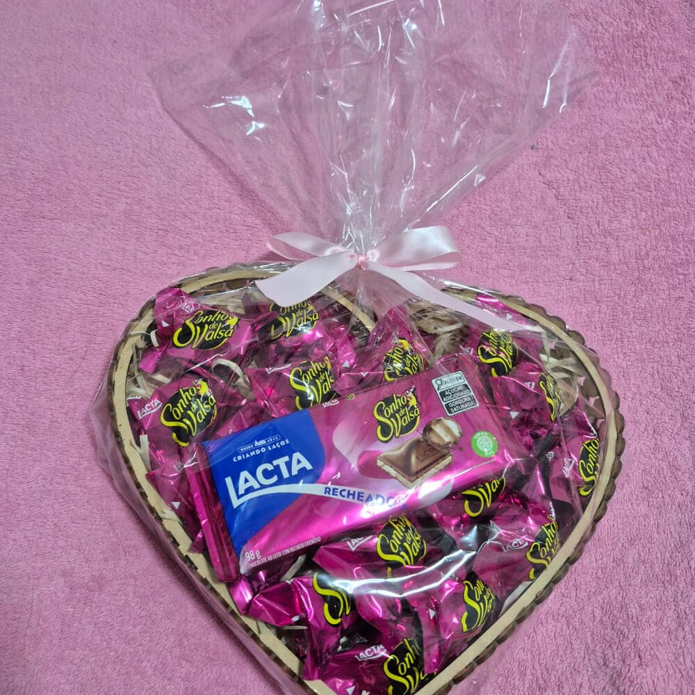 Surpreenda alguém especial com esta cesta em formato de coração, repleta de bombons Sonho de Valsa e uma deliciosa barra de chocolate Lacta. Embalada com delicadeza em papel transparente e finalizada com um laço de cetim cor-de-rosa, é perfeita para celebrar datas românticas, aniversários ou surpreender quem você ama.
