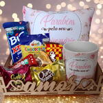 Cesta de Chocolates "Amor" com Caneca e Almofada Parabens pelo seu Aniversario
