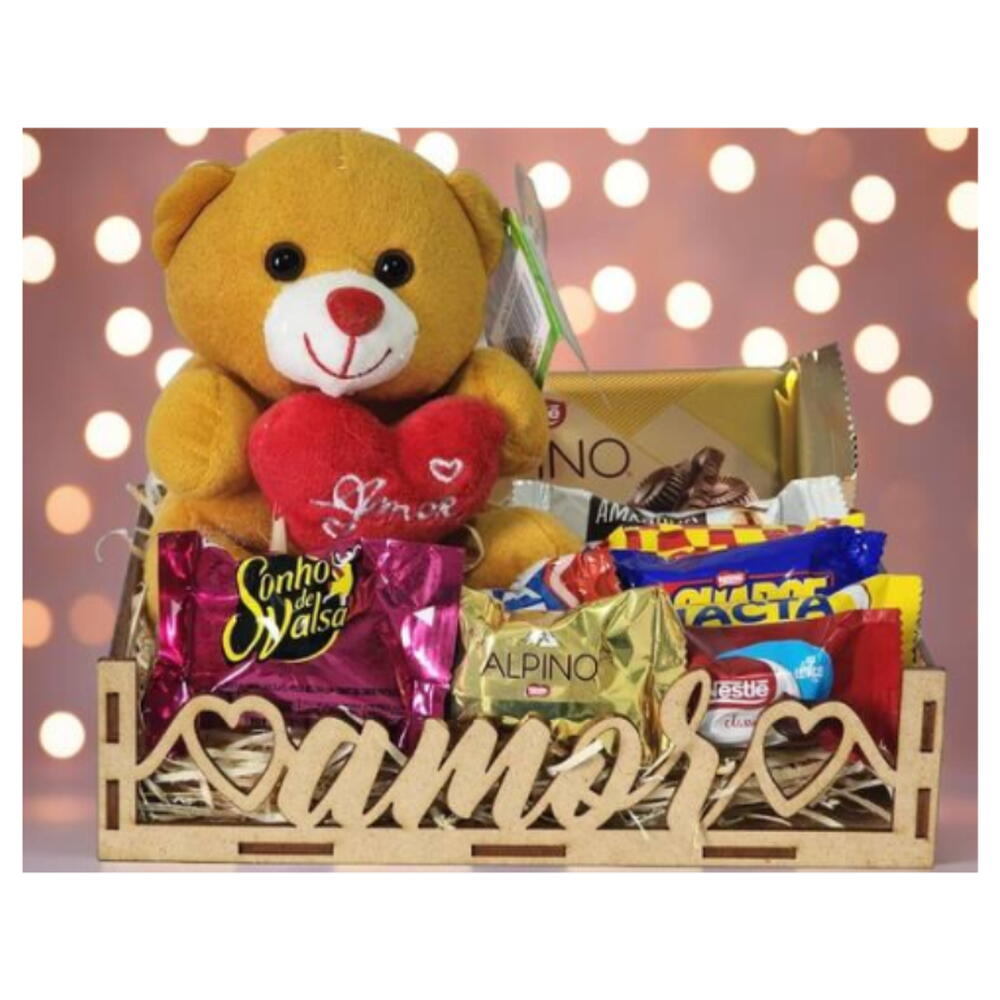 laço - 1 un. caixa mdf - 1 un. embalagem celofane - 1 un. bombons sortidos - 8 un. pelúcia com coração amor p - 1 un. barra lacta de chocolate 80g - 1 un.