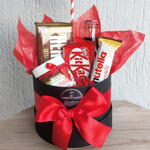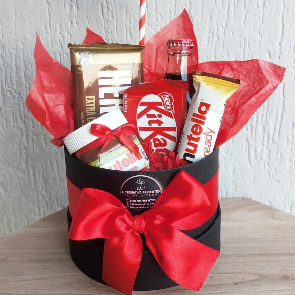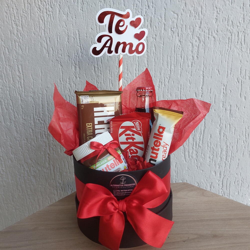 nutella - 1 un. b-ready nutella - 1 un. barra de chocolate hersheys - 1 un. kit-kat - 1 un. plaquinha te amo - 1 un. laço e saco celofane para embrulho - 1 un. box cartonada decorada - 1 un. coca-cola vidro 250ml - 1 un. chocolate ferrero rocher com 4un - 1 un.