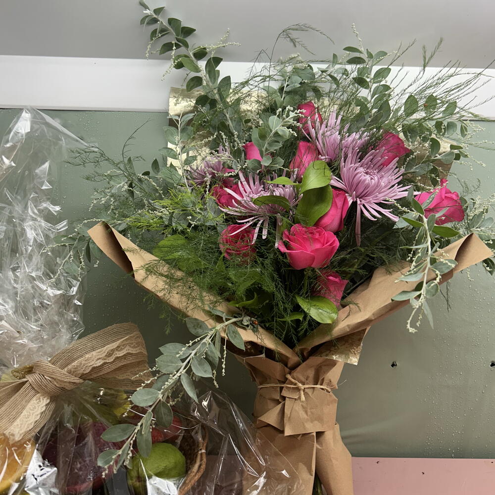 Esta cesta de frutas, deliciosamente combinada com flores frescas e folhagens especiais, é um presente perfeito para qualquer ocasião. Composto por uma unidade selecionada de frutas frescas (sujeito à disponibilidade), juntamente com uma dúzia de rosas e embalado em uma caixa Kraft rústica, este conjunto é finalizado com um laço e uma embalagem de celofane para um toque extra de elegância. Esta é a maneira ideal de mostrar a alguém o quanto você se importa.