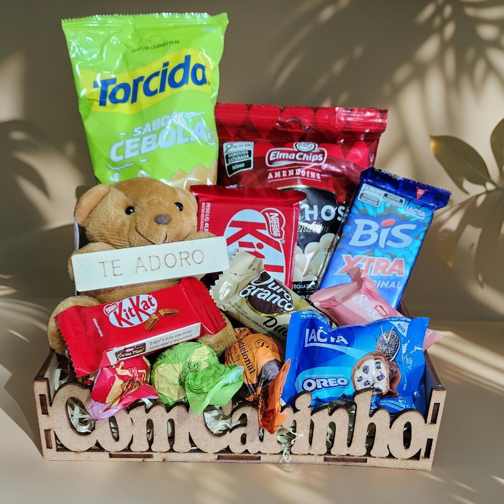Delicie-se com Nossa Cesta de Guloseimas com frase Com Carinho e mini Urso com plaquinha Te Adoro Cada item cuidadosamente selecionado é uma explosão de alegria. Seja para crianças ou adultos, nossa cesta de guloseimas é garantia de sorrisos e momentos felizes. É o presente perfeito para festas de aniversário, comemorações especiais ou simplesmente para alegrar o Dia de alguém querido. Embalada em papel selofane e decorada com lindo laço, nossa cesta é mais do que apenas uma apresentação de guloseimas; é uma obra de arte em si mesma. Cada detalhe foi pensado para criar uma experiência incrivel. Seja para presentear um amigo, colega de trabalho ou membro da família, nossa cesta de guloseimas é uma escolha infalível.